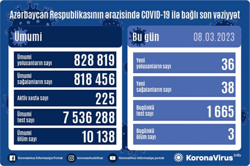 Azərbaycan Respublikasında koronavirus (COVID-19) infeksiyasına 36 yeni yoluxma faktı qeydə alınıb, 38 nəfər müalicə olunaraq sağalıb.