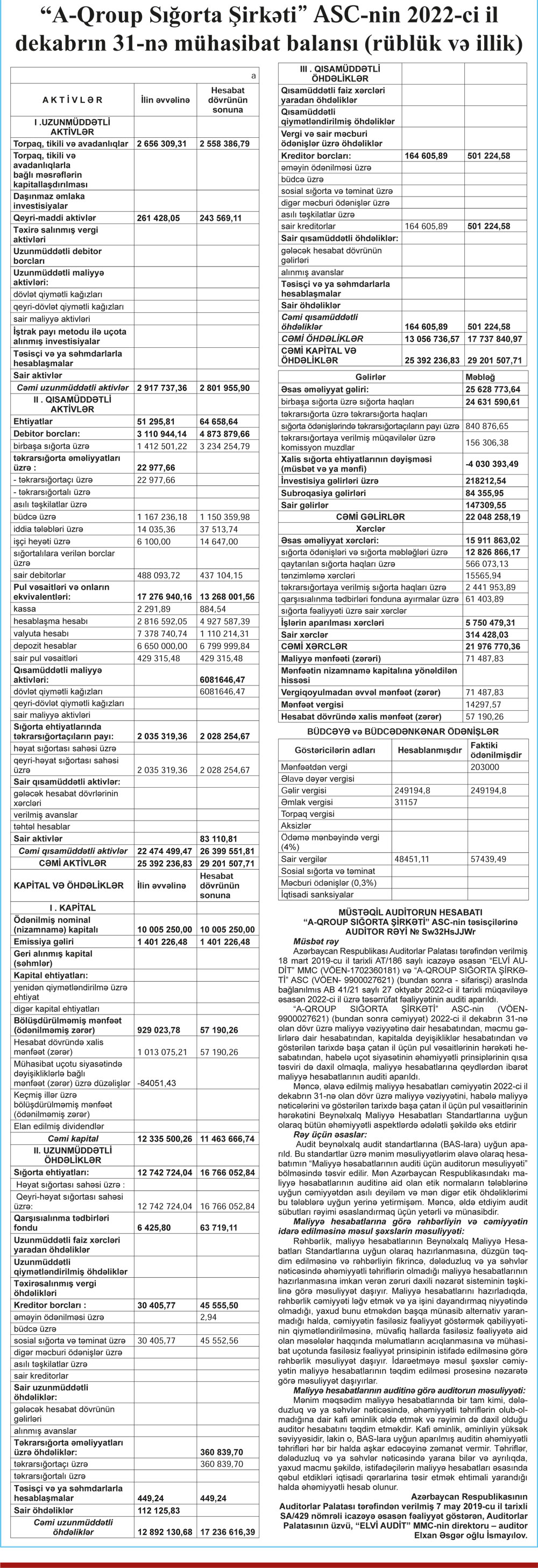 "A-Qroup Sığorta Şirkəti"nin 2021-ci ildə hesabladığı sığorta haqları 19 milyon 72 min manat ikən, 2022-ci ildə 24 milyon 632 min manat təşkil edib. Şirkətin sığorta ödənişləri isə 11 milyon 739 min 982 manatdan 12 milyon 826 min 866 (1 milyon 87 min manat artıb).
