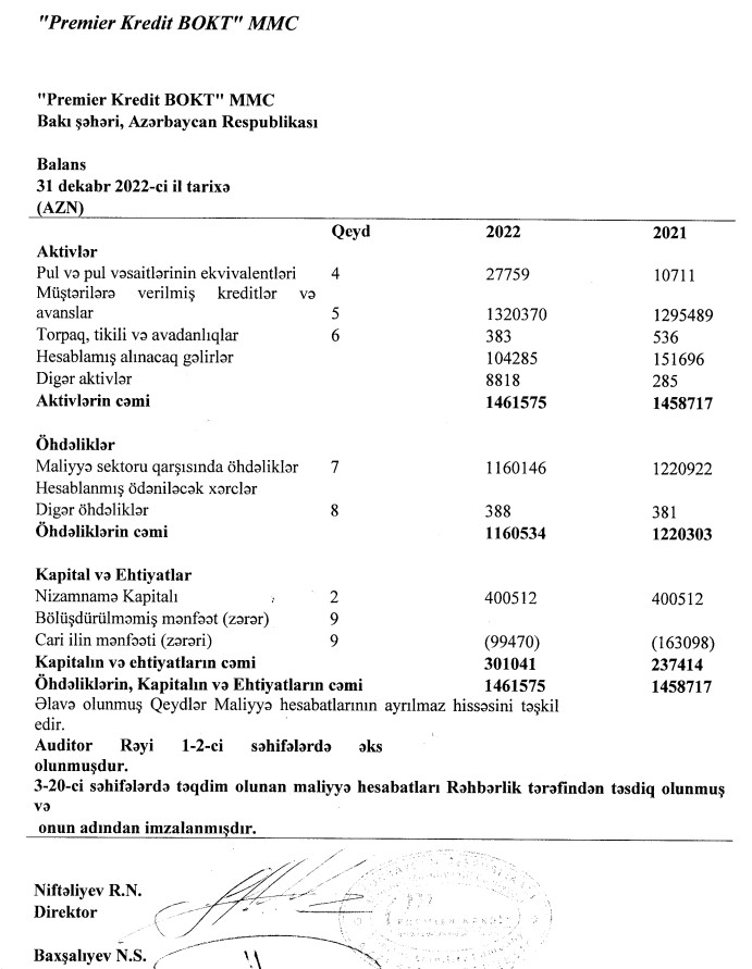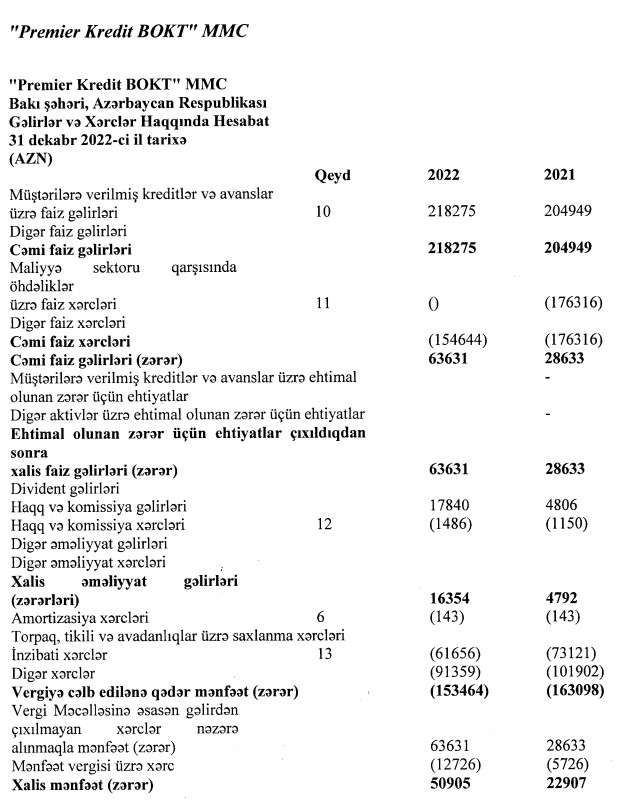 "Premier Kredit BOKT" MMC 2022-ci ili 50 min 905 manat xalis mənfəət ilə başa vurub. Təşkilat 2021-ci ili 22 min 907 manat xalis mənfəət ilə bağlamışdı. Beləliklə, 2021-ci illə müqayisədə 2022-ci ildə "Premier Kredit BOKT"ın xalis mənfəəti 2,2 dəfə artıb.