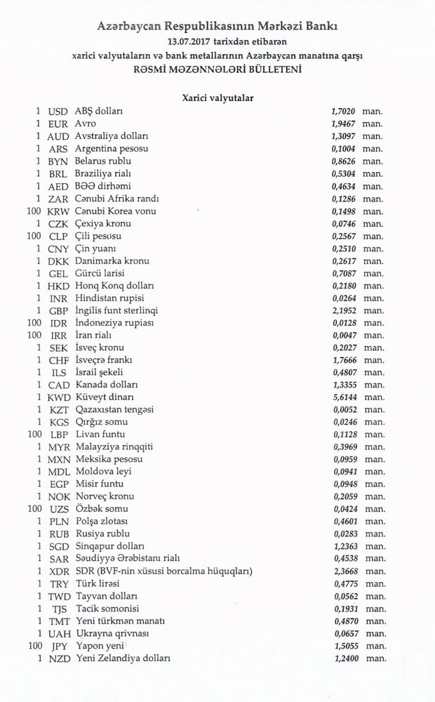 İyulun 13-nə Mərkəzi Bankın açıqladığı rəsmi Dollar/manat məzənnəsi İyulun 12-si ilə müqayisədə dəyişməyərək 1,7020 manat olub, Avro/manat məzənnəsi isə 1.9467 manata düşüb.