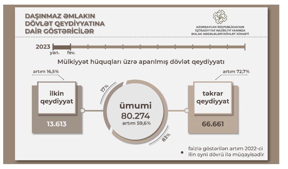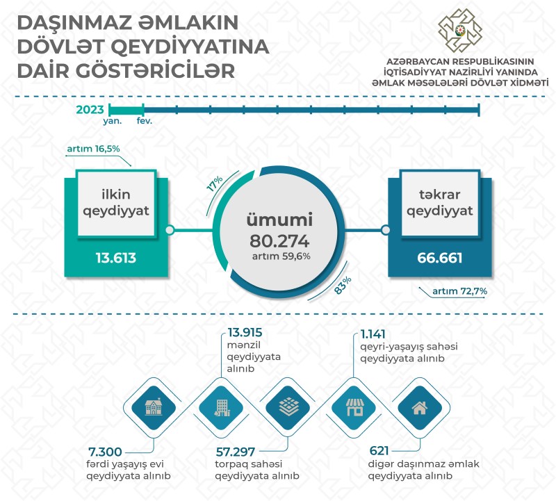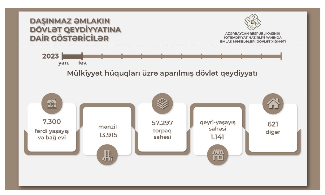 2023-cü ilin yanvar-fevral ayları ərzində mülkiyyət hüquqlarının qeydiyyatı aparılan əmlaklardan 7 300-ü fərdi yaşayış və bağ evi, 13 915-i mənzil, 57 297-si torpaq sahəsi, 506-sı qeyri-yaşayış binası, 1 141-i qeyri-yaşayış sahəsi, 89-u əmlak kompleksi, 26-sı isə çoxmərtəbəli yaşayış binasıdır. Bu dövrdə dövlət qeydiyyatına alınan daşınmaz əmlakların 13 803-ü Bakı şəhərinin, qalanı isə bölgələrin payına düşür.