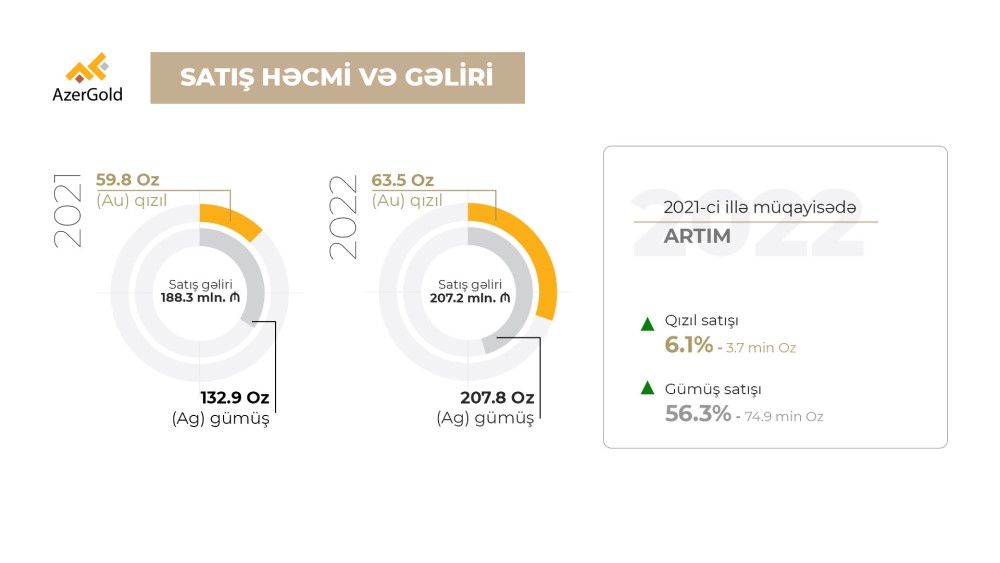 Ötən il “AzerGold” qızıl və gümüş satışı nəticəsində 207.2 milyon manat əldə edilib. 2017–2022-ci illər üzrə qızıl və gümüşün satışı nəticəsində əldə edilmiş gəlir isə 960.7 milyon manat olub.2022-ci ildə “AzerGold” QSC-nin beynəlxalq və daxili bazarlarda qızıl və gümüş satışı həcmlərində müsbət dinamika müşahidə edilib.