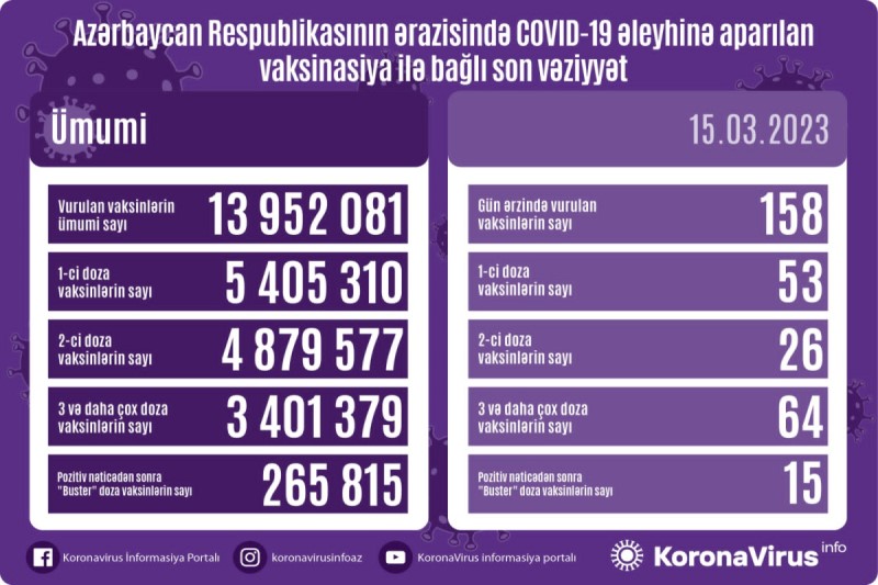 Azərbaycanda son sutkada koronavirus (COVID-19) əleyhinə 158 vaksin vurulub. Bir gündə birinci mərhələ üzrə vaksinasiya olunanların sayı 53, ikinci mərhələ üzrə vaksinasiya olunanların sayı 26, üç və daha çox doza vaksin vurduranların sayı 64, pozitiv nəticədən sonra buster doza üzrə vaksinasiya olunanların sayı isə 15 nəfərdir.