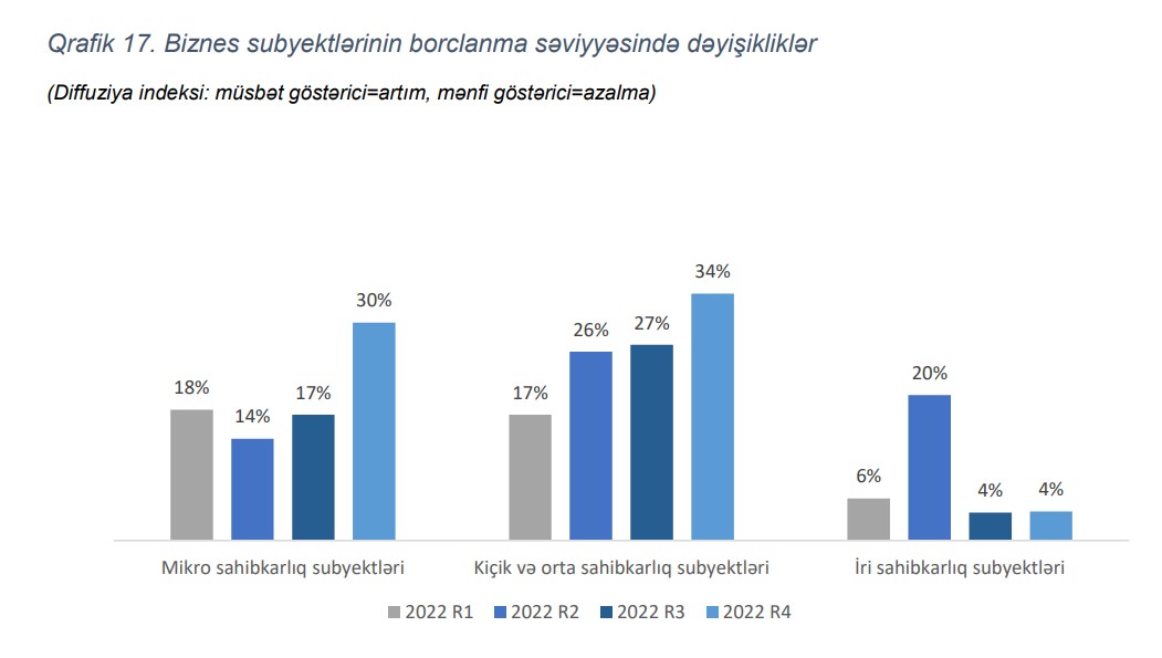 Bildirilib ki, borclanma səviyyəsində 2022-ci ilin III rübü ilə müqayisədə ən çox artım mikro sahibkarlıq subyektləri üzrə olmuşdur. İri sahibkarlıq subyektlərinin borclanma səviyyəsi isə stabil olaraq qalmışdır.