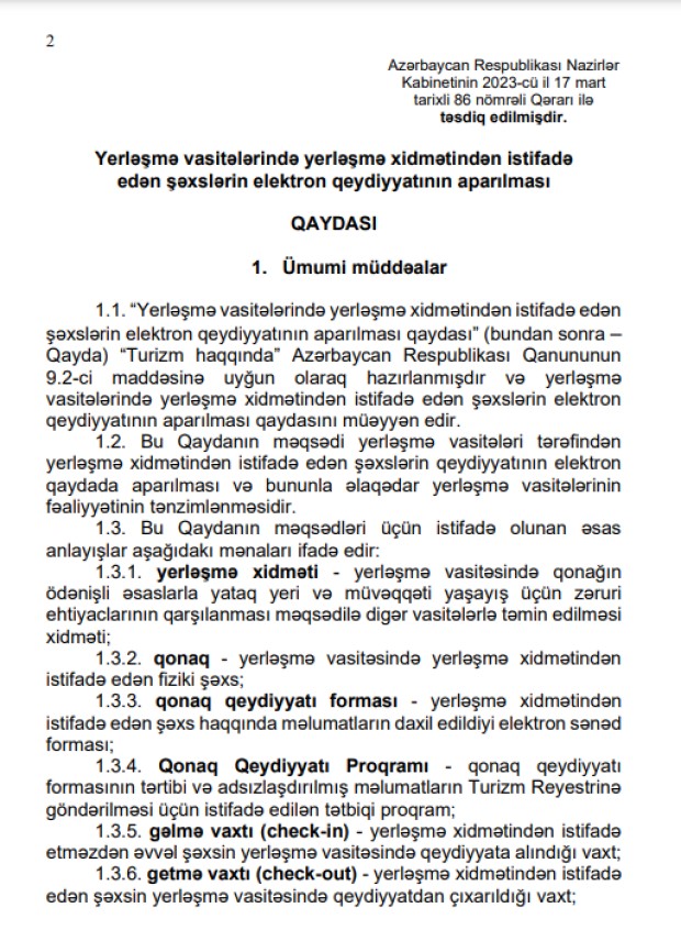 Azərbaycan Respublikasının Baş naziri Əli Əsədov “Yerləşmə vasitələrində yerləşmə xidmətindən istifadə edən şəxslərin elektron qeydiyyatının aparılması Qaydası”nı təsdiqləyib.