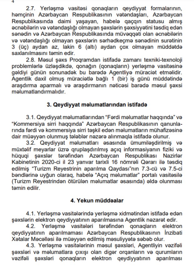 - yerləşmə vasitələrində qalan şəxslərin elektron qeydiyyatı həyata keçirilməklə ölkəyə gələn xarici qonaqların və yerli turistlərin dəqiq statistik hesabatlarının aparılması təmin ediləcək;