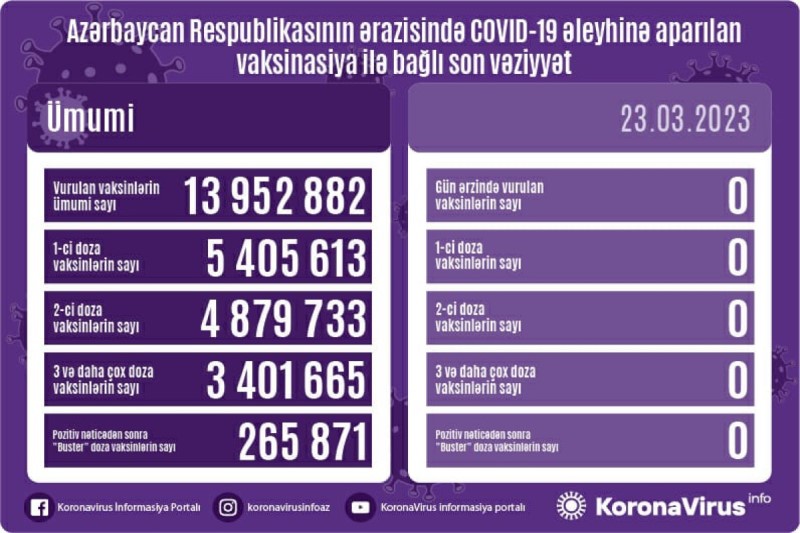 Nazirlər Kabineti yanında Operativ Qərargahdan APA-ya verilən məlumata görə, ölkədə vurulan vaksinlərin ümumi sayı 13 952 882, birinci mərhələ üzrə vaksinasiya olunanların ümumi sayı 5 405 613, ikinci mərhələ üzrə vaksinasiya olunanların sayı 4 879 733, 3-cü və daha çox doza üzrə vaksinasiya olunanların sayı 3 401 665, pozitiv nəticədən sonra buster doza olunanların sayı 265 871 təşkil edir.