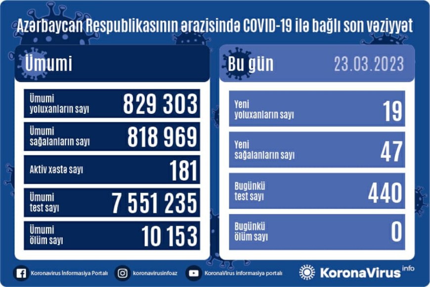 Azərbaycanda koronavirus (COVID-19) infeksiyasına 19 yeni yoluxma faktı qeydə alınıb, 47 nəfər müalicə olunaraq sağalıb.