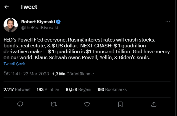 "FED sədri Pauel hər şeyi məhv etdi. Artan faiz dərəcələri səhmləri, istiqrazları, daşınmaz əmlakı və ABŞ dollarını çökdürəcək. Sonra nə olacaq? Sonrakı çöküş, kapitallaşması bir katrilyon dollar olan törəmə alətlər bazarında (fyuçers, opsionlar və s. - red) baş verəcək. Bir katrilyon dollar min trilyon dollara bərabərdir. Allah dünyamıza rəhmət eləsin" - deyə o, Twitter- də yazıb.