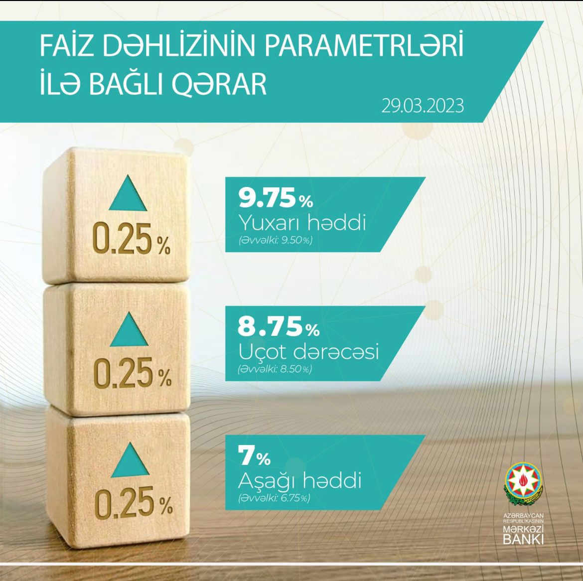 Azərbaycan Mərkəzi Bankı faiz qərarını açıqladı. Mərkəzi Bank faizlərini daha da qaldırdı.Azərbaycan Respublikası Mərkəzi Bankının İdarə Heyətinin qərarı ilə uçot dərəcəsi 8.75%-ə, faiz dəhlizinin aşağı həddi 7%-ə, faiz dəhlizinin yuxarı həddi isə 9.75%-ə qaldırılmışdır.