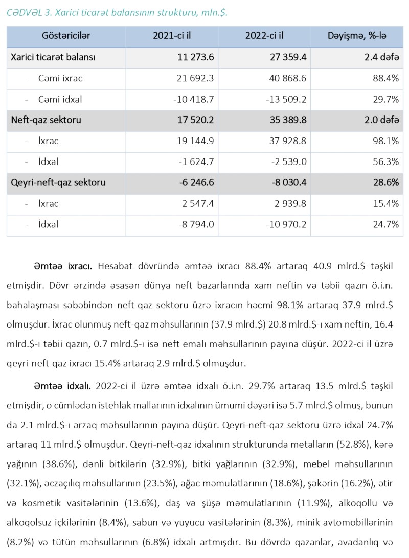 2022-ci il üzrə xarici ticarət dövriyyəsi 54.4 milyard dollar təşkil etmiş, neft-qaz sektoru üzrə 35.4 milyard dollar həcmində profisit, qeyri-neft-qaz sektoru üzrə 8 milyard dollar həcmində kəsiri bağlamışdır. Nəticədə hesabat dövründə xarici ticarət balansında 27.4 milyard dollar həcmində profisit yaranmışdır.