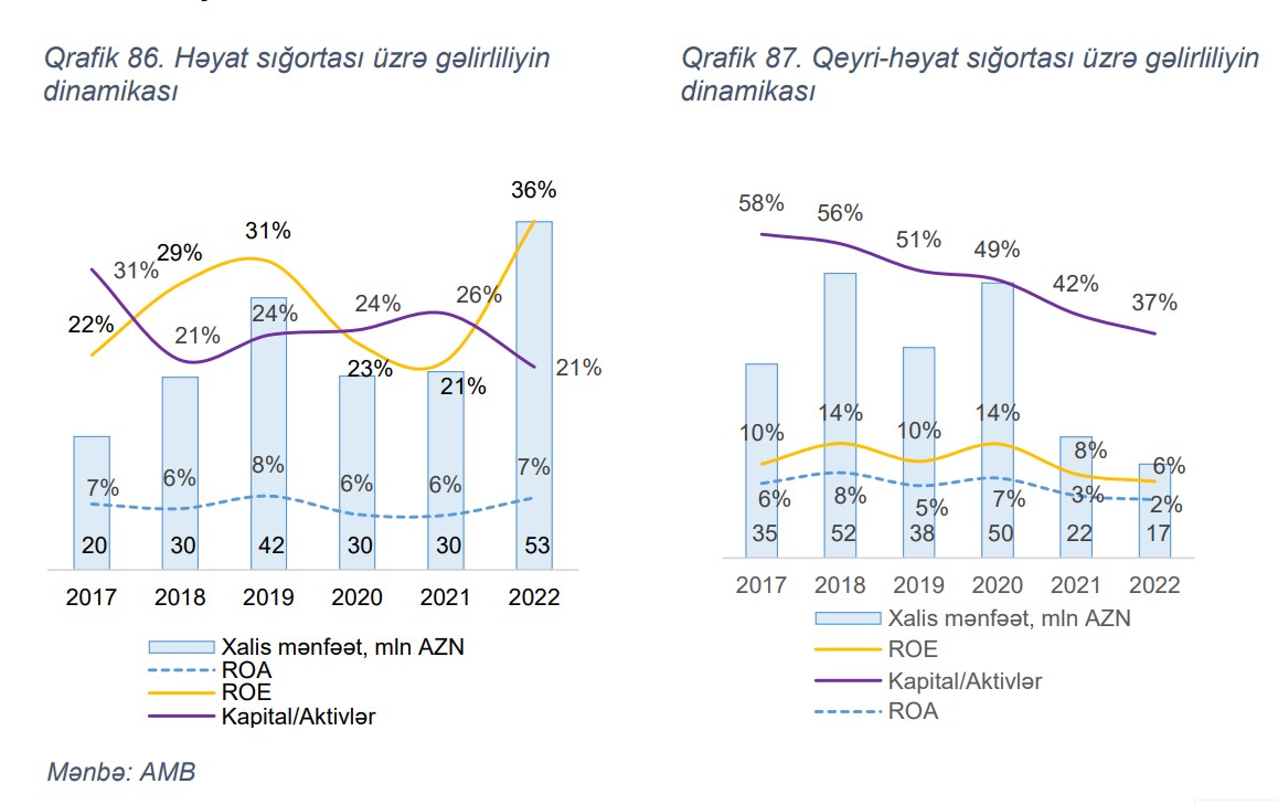 Hesabatda qeyd edilib ki, həyat və qeyri-həyat sinifləri üzrə gəlirlilik dinamikası fərqlənir. Son 5 ildə həyat sığorta sinifləri üzrə xalis mənfəət 2 dəfədən çox artaraq 53 milyon manata çatmışdır, ROA əmsalı aktivlərin də müvafiq artımı səbəbilə eyni səviyyədə qalmış, ROE əmsalı isə 14 faiz bəndi artmışdır. Belə ki, haqların və müvafiq olaraq aktivlərin artımı nəticəsində kapitalın aktivlərə nisbəti 10 faiz bəndi azalmışdır. Qeyri-həyat sığorta sinifləri üzrə son 5 ildə xalis mənfəət 2 dəfə azalaraq 17 mln. manat təşkil etmişdir. Mənfəətlilik göstəriciləri olan ROA əmsalında 4 faiz bəndi , ROE əmsalında isə 4 faiz bəndi azalma müşahidə edilmişdir. Sektorun leverec göstəricisində də artım müşahidə edilir. Belə ki, kapitalın aktivlərə nisbətində 21 faiz bəndi azalma müşahidə edilir.