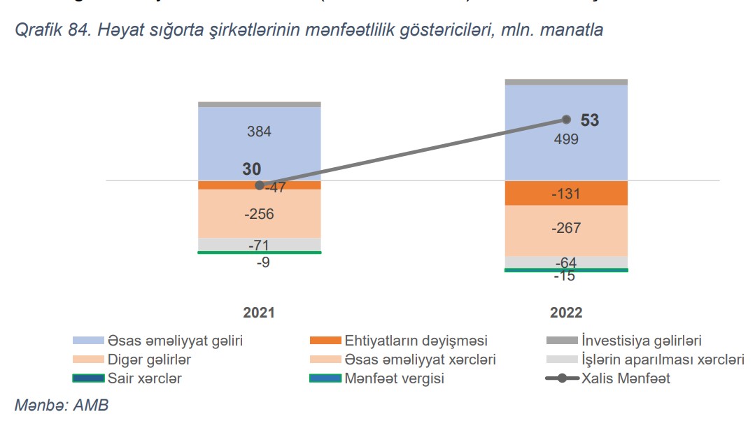 Qeyd edilib ki, il ərzində həyat sektorunun mənfəətliliyi artmışdır. Belə ki, sektorun xalis mənfəəti (76% və ya 23 milyon manat) artaraq 53 milyon manat təşkil etmişdir. Mənfəətlilik əsasən il ərzində əməliyyat gəlirlərinin 30% (115 milyon manat) artımı, işlərin aparılması xərclərinin 10% (7.1 milyon manat) azalması hesabına təmin edilib. Mənfəətliliyə azaldıcı təsir edən əsas amillər isə xalis sığorta ehtiyatlarının 1.8 dəfə (84.4 milyon manat) artması olmuşdur.
