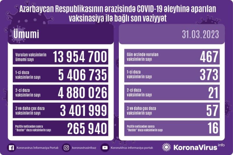 Azərbaycanda son sutkada koronavirus (COVID-19) əleyhinə 467 vaksin vurulub Bir gündə birinci mərhələ üzrə vaksinasiya olunanların sayı 373, ikinci mərhələ üzrə vaksinasiya olunanların sayı 21, üç və daha çox doza üzrə vaksinasiya olunanların sayı 57, pozitiv nəticədən sonra buster doza üzrə vaksinasiya olunanların sayı 16 nəfərdir.