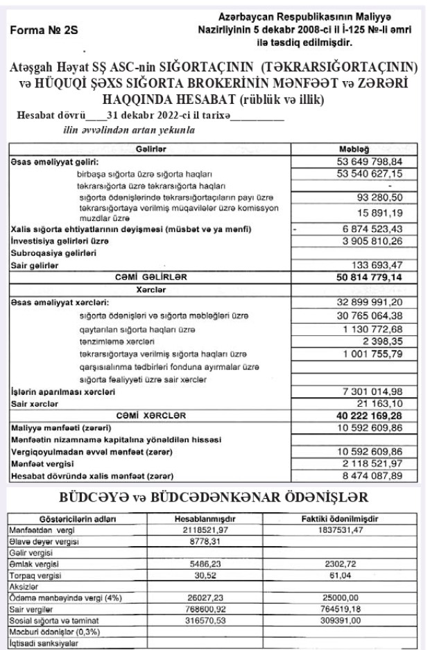 "Atəşgah Həyat Sığorta Şirkəti" ASC 2022-ci ili 8 milyon 474 min manat xalis mənfəət ilə başa vurub.