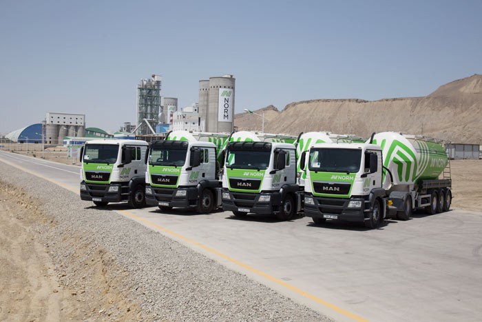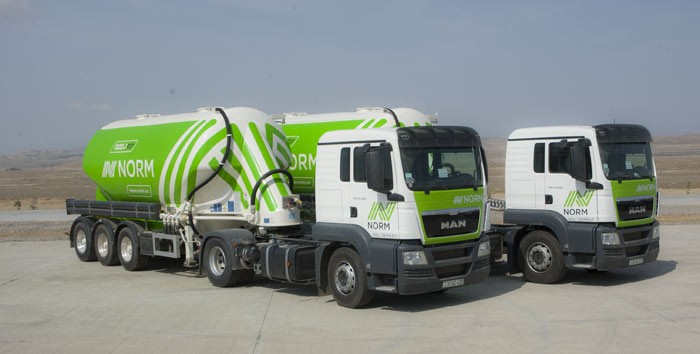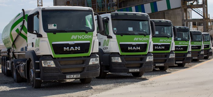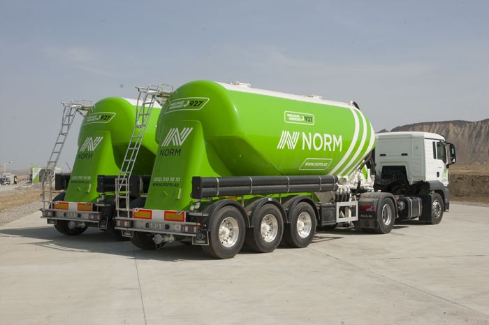Zavodun qalaq məhsullarını daşıyan nəqliyyat vasitələrinin üzərində NORM loqosu əks etdirilir və hər birində təqribən 30 ton sement daşınır.