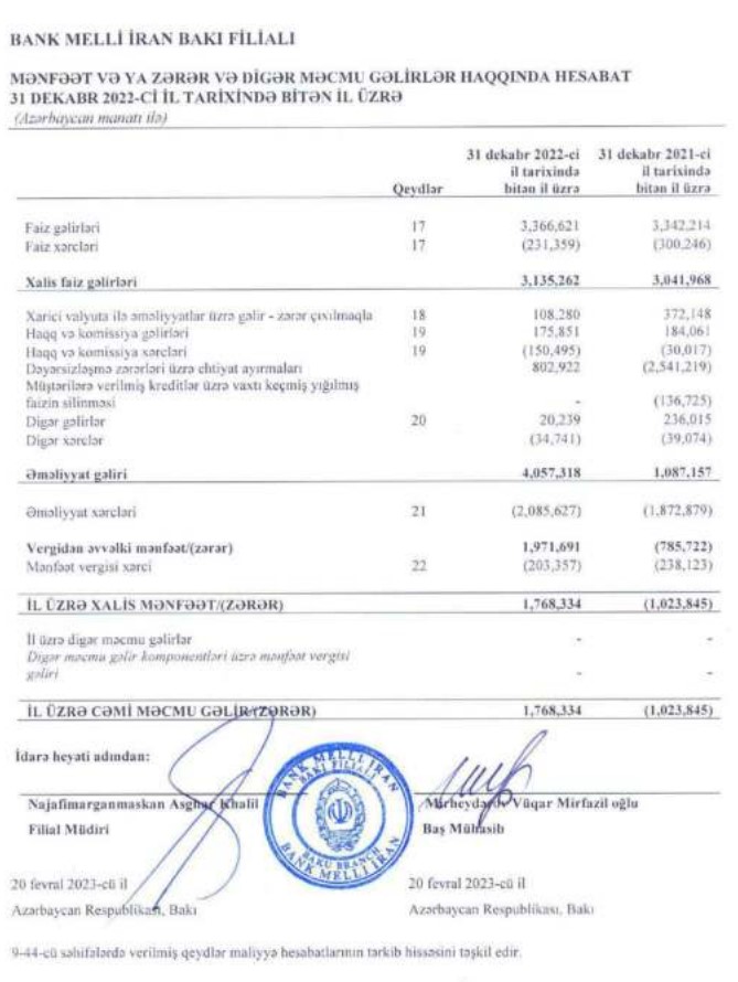Bank Melli İran Bakı filialı 2022-ci ili 1 milyon 768 min manat xalis mənfəət ilə başa vurub. Marja.az xəbər verir ki, bu, filialın 31 dekabr 2022-ci il tarixində bitən il üzrə Maliyyə Hesabatlarının Beynəlxalq Standartlarına uyğun hazırlanmış Maliyyə Hesabatlarından məlum olur.