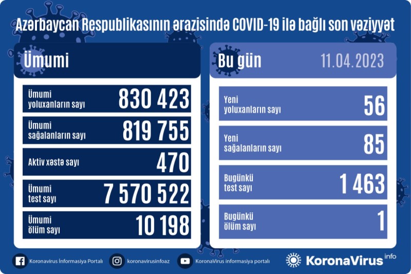 Azərbaycan Respublikasında koronavirus (COVID-19) infeksiyasına 56 yeni yoluxma faktı qeydə alınıb, 85 nəfər müalicə olunaraq sağalıb.