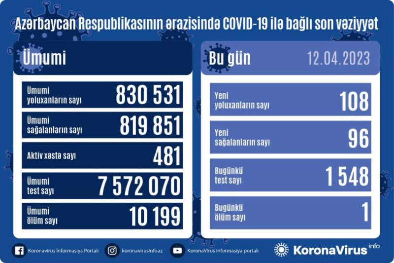 Azərbaycan Respublikasında koronavirus (COVID-19) infeksiyasına 108 yeni yoluxma faktı qeydə alınıb, 96 nəfər müalicə olunaraq sağalıb.