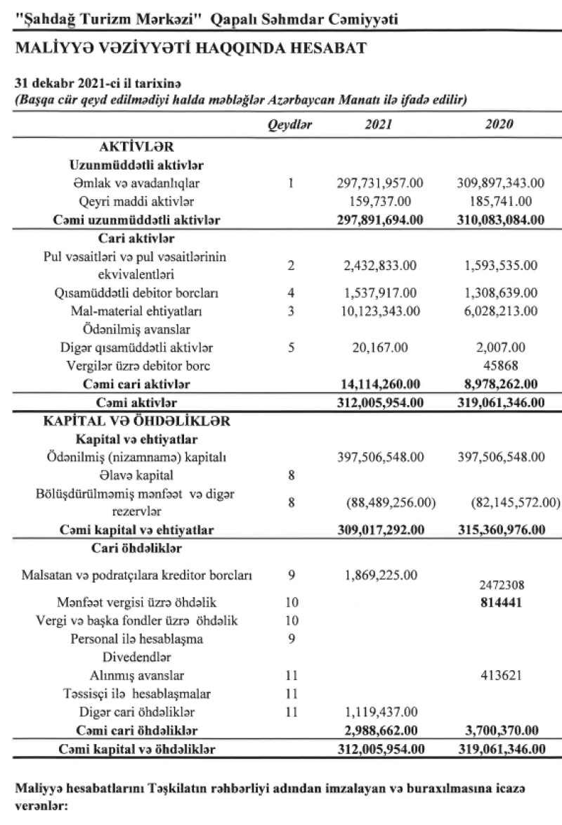 "Şahdağ Turizm Mərkəzi" QSC 31 dekabr 2021-ci il tarixində 312 milyon 5 min manat cəmi aktivlərə malik olub (2020-ci ilin sonunda 320 milyon 61 min manat).