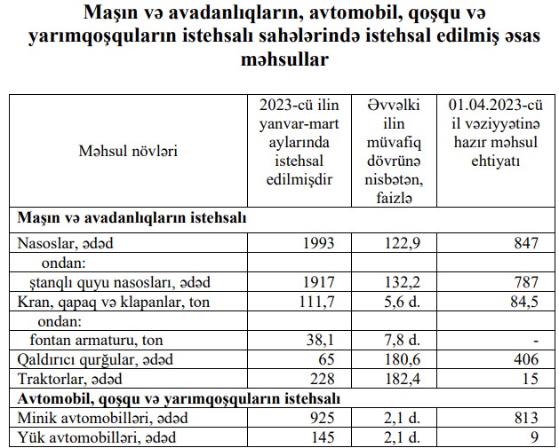2023-сü ilin yanvar-mart aylarında (ilk rübdə) 925 ədəd və ya əvvəlki ilin müvafiq dövrü ilə müqayisədə 486 ədəd çox (2,1 dəfə çox) minik avtomobili istehsal olunub.