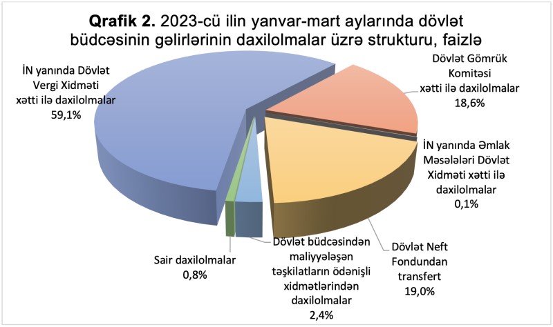 2023-cü ilin yanvar-mart aylarında dövlət büdcəsinin daxilolmalarının 4 milyard 899,5 milyon manatı və ya 59,1 faizi Azərbaycan Respublikası İqtisadiyyat Nazirliyi yanında Dövlət Vergi Xidmətinin, 1 milyard 576,0 milyon manatı və ya 19,0 faizi Azərbaycan Respublikasının Dövlət Neft Fondundan dövlət büdcəsinə transfertin, 1 milyard 545,0 milyon manatı və ya 18,6 faizi Azərbaycan Respublikası Dövlət Gömrük Komitəsinin daxilolmaların, 198,4 milyon manatı və ya 2,4 faizi dövlət büdcəsindən maliyyələşən təşkilatların ödənişli xidmətlərindən daxilolmaların, 63,2 milyon manatı və ya 0,8 faizi sair daxilolmaların, 7,9 milyon manatı və ya 0,1 faizi Azərbaycan Respublikası İqtisadiyyat Nazirliyi yanında Əmlak Məsələləri Dövlət Xidmətinin payına düşür.