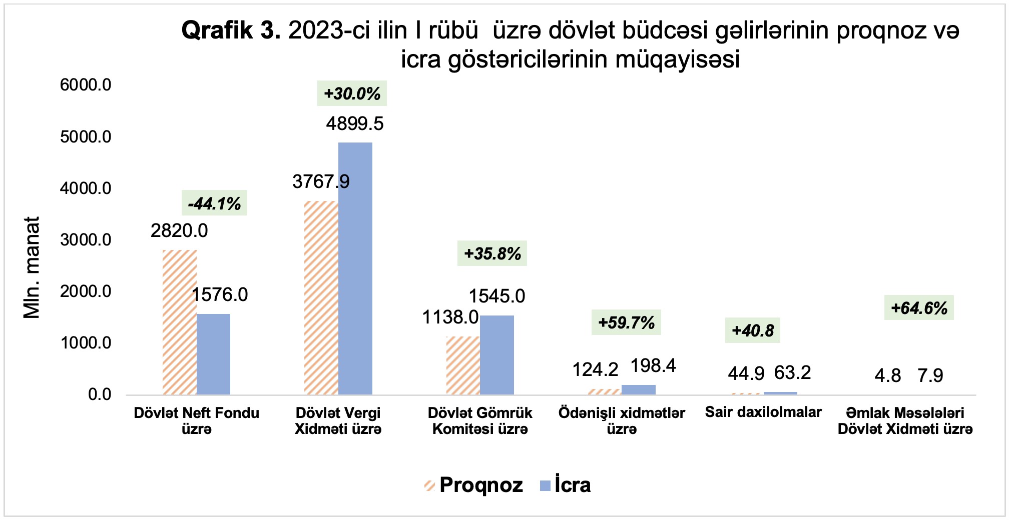 2023-cü ilin yanvar-mart ayları ərzində dövlət büdcəsinin gəlirləri təsdiq edilmiş proqnozdan Dövlət Vergi Xidməti üzrə 1 milyard 131,6 milyon manat və ya 30,0 faiz çox, Dövlət Gömrük Komitəsi üzrə 407,0 milyon manat və ya 35,8 faiz çox, Əmlak Məsələləri üzrə Dövlət Xidməti üzrə 3,1 milyon manat və ya 64,6 faiz çox, büdcə təşkilatlarının ödənişli xidmətlərindən daxilolmalar üzrə 74,2 milyon manat və ya 59,7 faiz çox, sair daxilolmalar üzrə 18,3 milyon manat və ya 40,8 faiz çox icra edilmişdir.