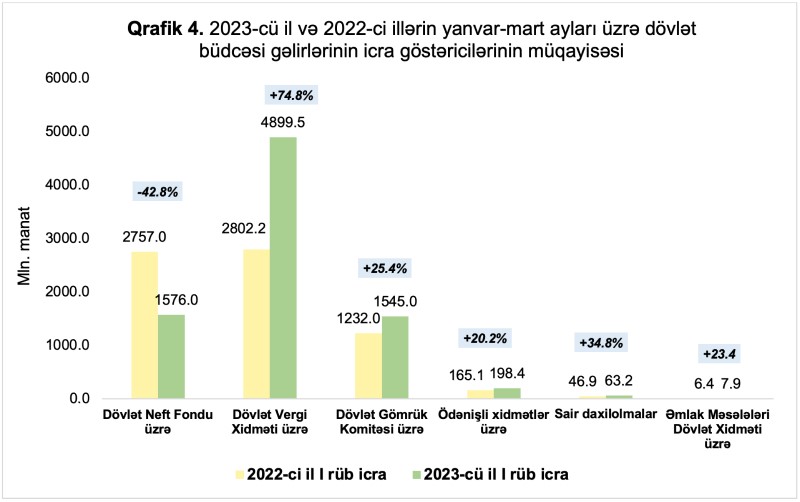 2023-cü ilin yanvar-mart ayları üzrə dövlət büdcəsinin gəlirləri 2022-ci ilin həmin dövrü ilə müqayisədə Dövlət Vergi Xidməti üzrə 2 milyard 97,3 milyon manat və ya 74,8 faiz çox, Dövlət Gömrük Komitəsi üzrə 313,0 milyon manat və ya 25,4 faiz çox, Əmlak Məsələləri Dövlət Xidməti üzrə 1,5 milyon manat və ya 23,4 faiz çox, büdcə təşkilatlarının ödənişli xidmətlərindən daxilolmalar üzrə 33,3 milyon manat və ya 20,2 faiz çox, sair daxilolmalar üzrə 16,3 milyon manat və ya 34,8 faiz çox, Dövlət Neft Fondudan transfert üzrə 1 milyard 181 milyon manat və ya 42,8 faiz az icra edilmişdir.