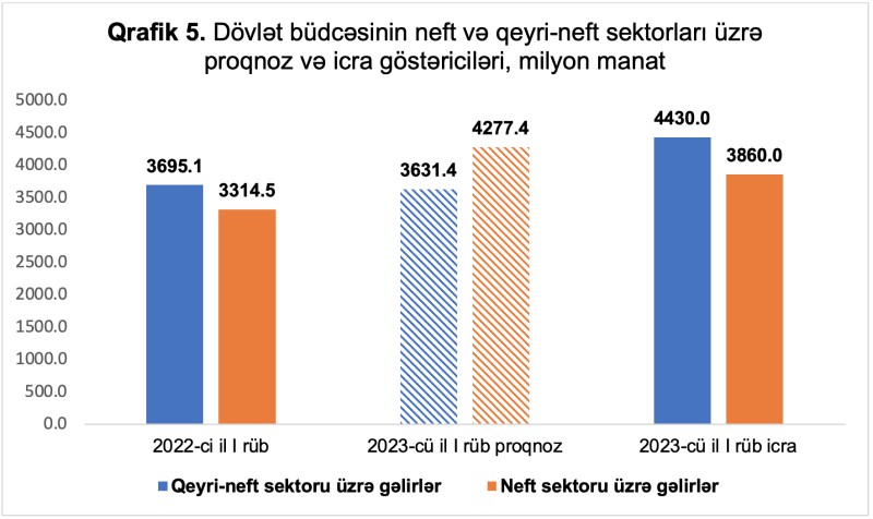 Dövlət büdcəsinin neft sektoru üzrə daxilolmaları 3 milyard 860 milyon manat təşkil etmişdir ki, bu da proqnozla müqayisədə 417,4 milyon manat və ya 9,8 faiz az (Dövlət Neft Fondundan nəzərdə tutulandan 1 milyard 244 milyon manat az vəsait daxil olub), 2022-ci ilin müvafiq dövrü ilə müqayisədə isə 545,5 milyon manat və ya 16,5 faiz çoxdur.
