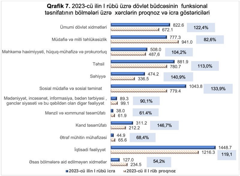 2023-cü ilin yanvar-mart aylarında dövlət büdcəsinin funksional təsnifatına görə kənd təsərrüfatı xərcləri 146,7 faiz icra edilməklə 311,2 milyon manat, səhiyyə xərcləri 140,9 faiz icra edilməklə 474,2 milyon manat, sosial müdafiə və sosial təminat xərcləri 133,9 faiz icra edilməklə 1 milyard 43,8 milyon manat, ümumi dövlət xidmətləri xərcləri 122,4 faiz icra edilməklə 822,6 milyon, iqtisadi fəaliyyət xərcləri 119,1 faiz icra edilməklə 1 milyard 448,7 milyon manat, təhsil xərcləri 113 faiz icra edilməklə 881,9 milyon manat, məhkəmə hakimiyyəti, hüquq-mühafizə və prokurorluq bölməsi üzrə xərcləri 104,2 faiz icra edilməklə 508,0 milyon manat, mədəniyyət, incəsənət, informasiya, bədən tərbiyəsi, gənclər siyasəti və bu qəbildən olan digər fəaliyyət xərcləri 90,1 faiz icra edilməklə 89,3 milyon manat, müdafiə və milli təhlükəsizlik xərcləri 82,6 faiz icra edilməklə 777,3 milyon manat, ətraf mühitin mühafizəsi xərcləri 68,4 faiz icra edilməklə 44,9 milyon manat, mənzil və kommunal təsərrüfatı xərcləri 61,4 faiz icra edilməklə 38,0 milyon manat, əsas bölmələrə aid edilməyən xidmətlər bölməsi üzrə xərcləri 54,2 faiz icra edilərək 127 milyon manat təşkil etmişdir.