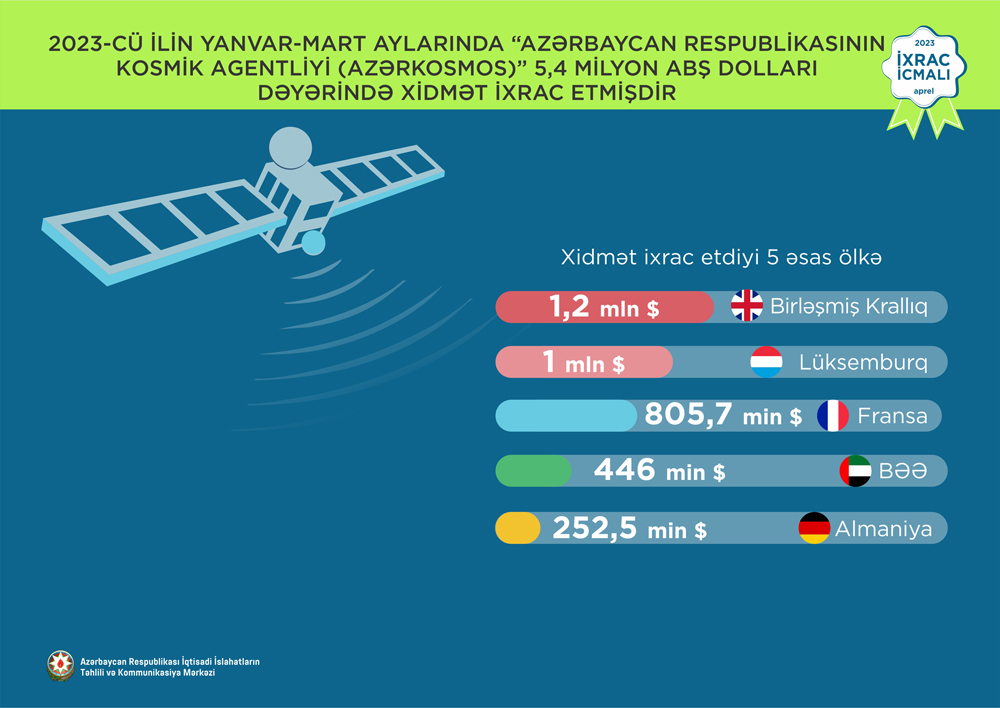 2023-cü ilin yanvar-mart ayları ərzində peyk telekommunikasiya və optik peyk xidmətlərinin ixracının ilk beşliyində isə 1,2 milyon ABŞ dolları ilə Birləşmiş Krallıq, 1 milyon ABŞ dolları ilə Lüksemburq, 805,7 min ABŞ dolları ilə Fransa, 446 min ABŞ dolları ilə BƏƏ və 252,5 min ABŞ dolları ilə Almaniya qərarlaşıb.