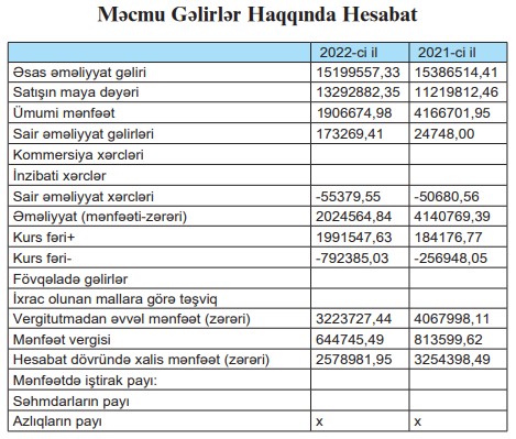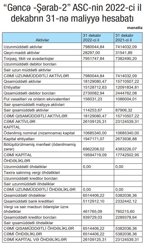 Marja.az Şirkətin 31 dekabr 2022-ci il tarixinə olan maliyyə hesabatına istinadən xəbər verir ki, “Gəncə -Şərab-2” ASC-nin satışdan gəlirləri 2021-ci ildə 15 milyon 386 min manat ikən, 2022-ci ildə 15 milyon 199 min manata düşüb (187 min manat azalıb). Satışın maya dəyəri isə 2 milyon 73 min manat artaraq 13 milyon 293 min manat təşkil edib. Maya dəyərinin artması ilə əlaqədar olaraq Şirkətin ümumi mənfəəti 2,2 dəfə azalaraq 2021-ci ildəki 4 milyon 167 min manatdan 2022-ci ildə 1 milyon 907 min manata geriləyib.
