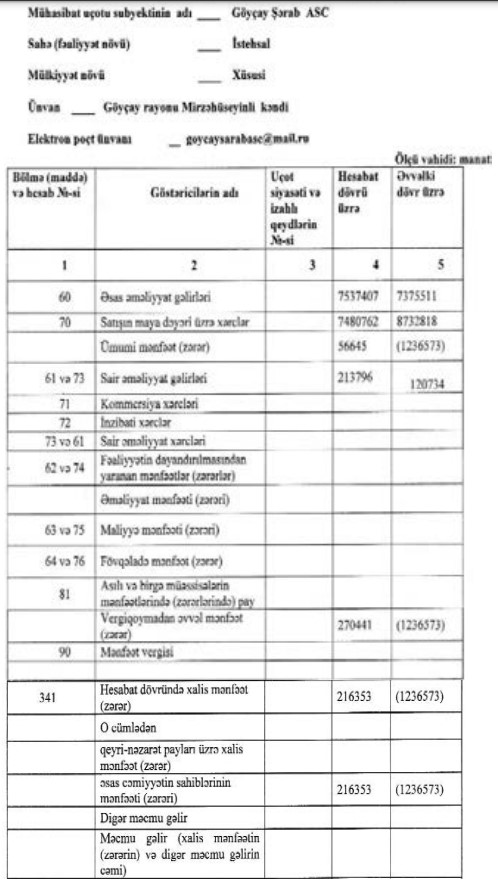 "Göyçay Şərab" ASC 2022-ci ili 216 min manat xalis mənfəət ilə başa vurub. Halbuki, ASC 2020-ci ili 818 min manat, 2021-ci ili 1 milyon 237 min manat xalis zərər ilə bağlamışdı. "Göyçay Şərab"ın xalis mənfəətə çıxmasının səbəbləri satışdan gəlirlərinin artması fonunda maya dəyəri üzrə xərclərinin azalmasıdır.