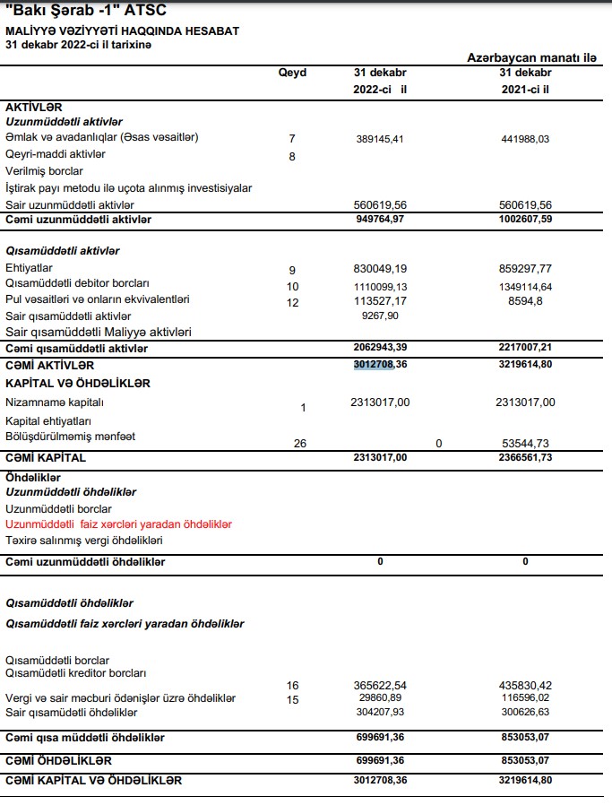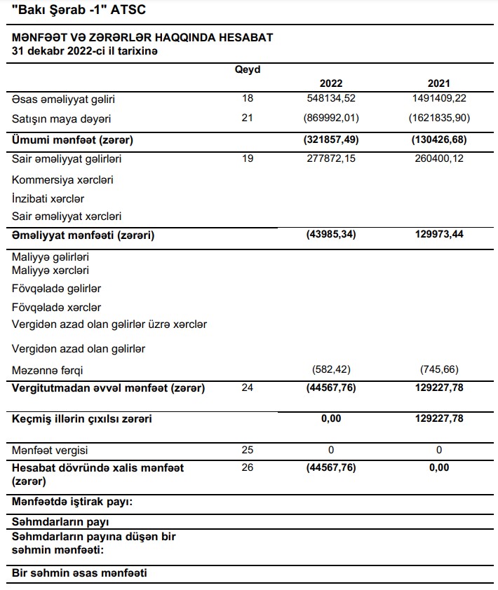 "Bakı Şərab -1" ATSC 2022-ci ili 44 min 568 manat xalis zərər ilə başa vurub. Halbuki, 2021-ci ildə şirkət nə mənfəət, nə də zərər etmişdi.
