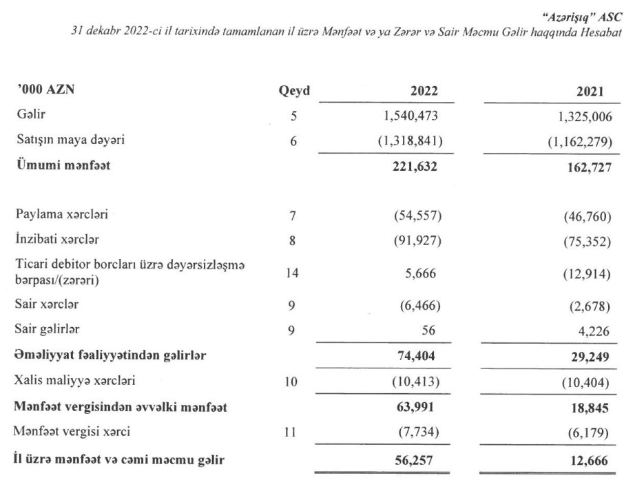 Dövlətə məxsus "Azərişıq" ASC 2022-ci ili 56 milyon 257 min manat xalis mənfəət ilə başa vurub. Şirkət 2021-ci ili 12 milyon 666 min manat xlias mənfəət ilə bağlamışdı.