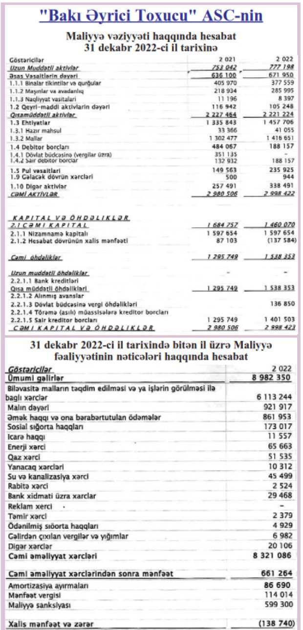 "Bakı Əyrici Toxucu" ASC 2022-ci ili 139 min manat xalis zərər ilə başa vurub.