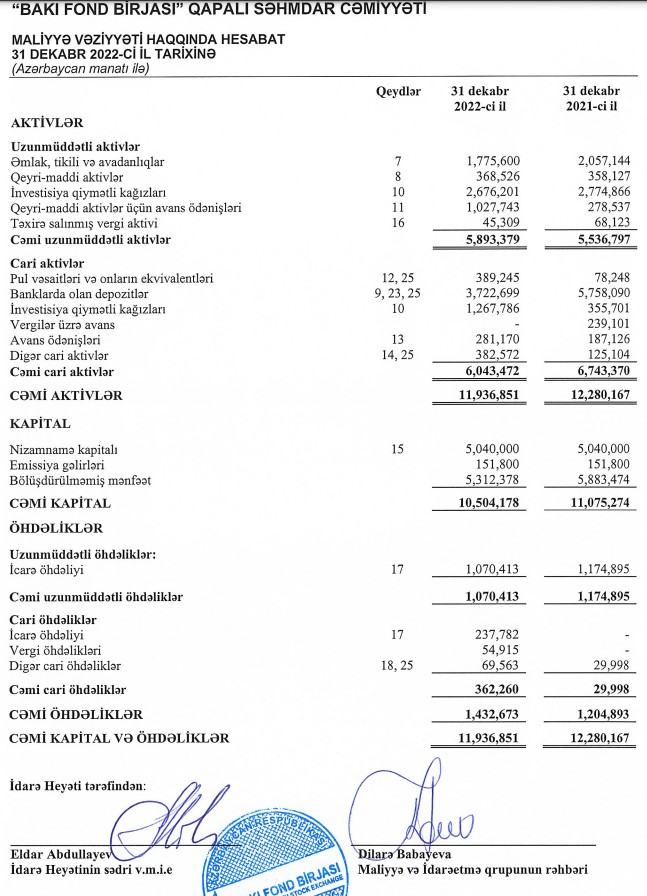 Marja.az QSC-nin 31 dekabr 2022-ci il tarixində başa çatmış il üzrə Maliyyə Hesabatlarının Beynəlxalq Standartlarına uyğun Hazırlanmış Maliyyə Hesabatlarına istinadən xəbər verir ki, "Bakı Fond Birjası"nın cəmi gəlirləri 2021-ci ildə 1 milyon 884 min manat ikən, 2022-ci ildə 2 milyon 211 min manat təşkil edib (327 min manat artıb).