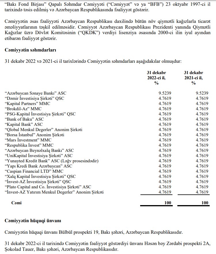 "Bakı Fond Birjası" QSC (BFB) 2022-ci ili 256 min manat xalis zərər ilə başa vurub. Birja 2021-ci ili 270 min manat xalis zərər ilə bağlamışdı. Beləliklə, BFB-nin xalis zərəri 5,2% azalıb.
