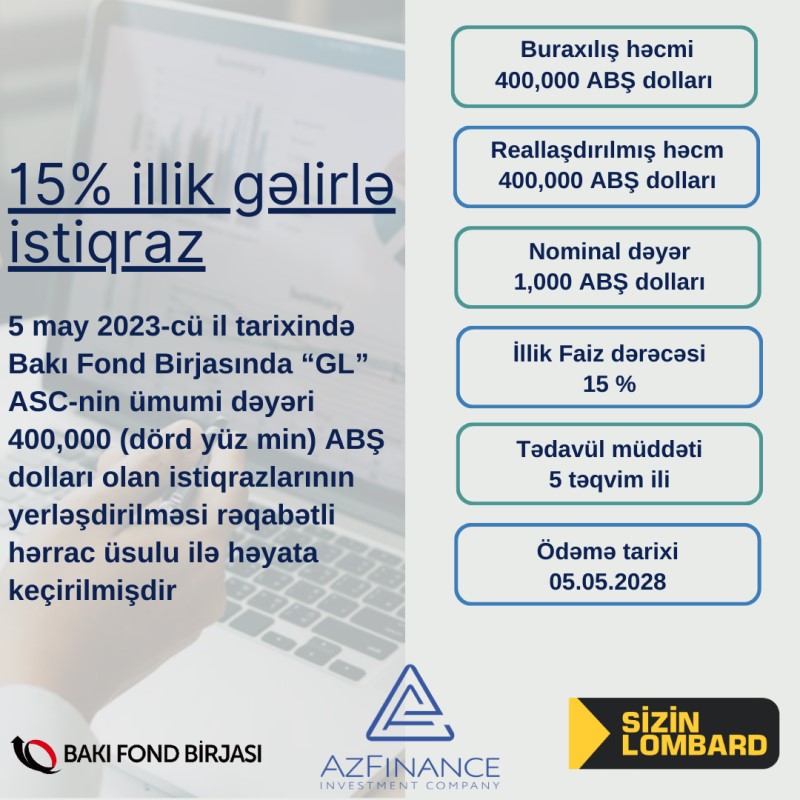 “GL” ASC-nin istiqrazlarının yerləşdirilməsi üzrə hərrac keçirilib.5 may 2023-cü il tarixində Bakı Fond Birjasında “GL” ASC-nin tədavül müddəti 5 təqvim ili, nominal dəyəri 1 000 ABŞ dolları olan AZ2009020283 dövlət qeydiyyat nömrəli, 400 min ABŞ dolları həcmində olan, faizli, təmin edilməmiş sənədsiz, adlı istiqrazlarının yerləşdirilməsi üzrə hərrac yekunlaşıb.