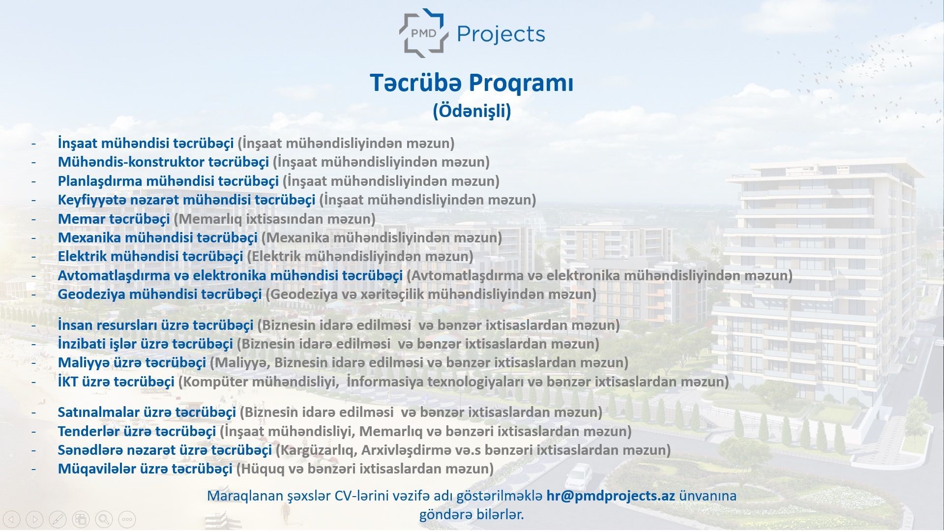 (®) Azərbaycanda tikinti sahəsində ixtisaslaşmış “PMD Projects” MMC qeyd olunmuş sahələr üzrə 3 aylıq ödənişli "Təcrübə proqramı" elan edir.