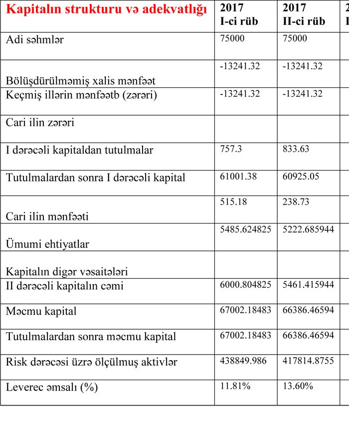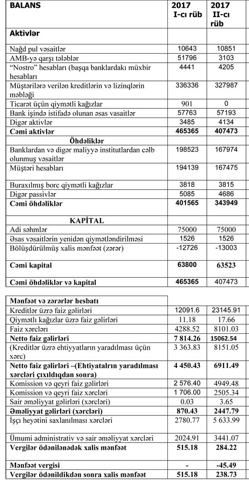 Cari ilin ikinci rübündə birinci rüblə müqayisədə, Bankın aktivəri 465,4 milyon manatdan 407,5 milyon manata, öhdəlikləri 401,6 milyon manatdan 343,9 milyon manata, cəmi balans kapitalı isə 63,8 milyon manatdan 63,52 milyon manata geriləyib.
