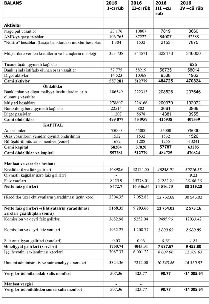 Bankın kredit portfeli 336,3 milyon manatdan 328 milyon manata, müştəri hesabları isə 194,1 milyon manatdan 167,5 milyon manata geriləyib.