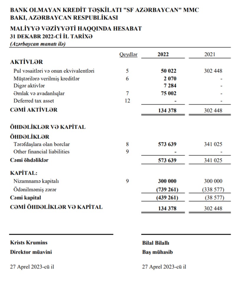 "SF Azərbaycan" BOKT MMC-nin 2022-ci il üzrə maliyyə hesabatları