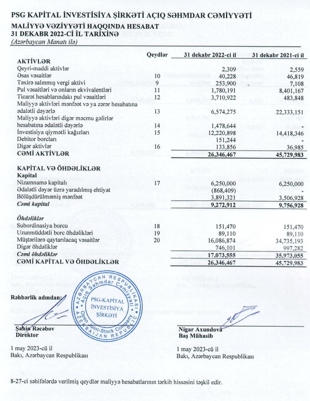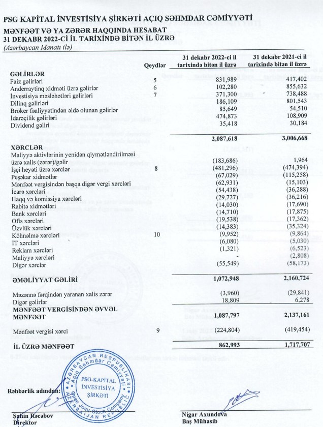 "PSG-Kapital İnvestisiya Şirkəti" QSC 2022-ci ili 863 min manat xalis mənfəət ilə başa vurub. Halbuki, Şirkət 2021-ci ili 1 milyon 718 min manat xalis mənfəət ilə bağlamışdı. Beləliklə, "PSG-Kapital"ın xalis mənfəəti 2022-ci ildə 2021-ci illə müqayisədə 855 min manat və ya 49,7% (təxminən 2 dəfə) azalıb.