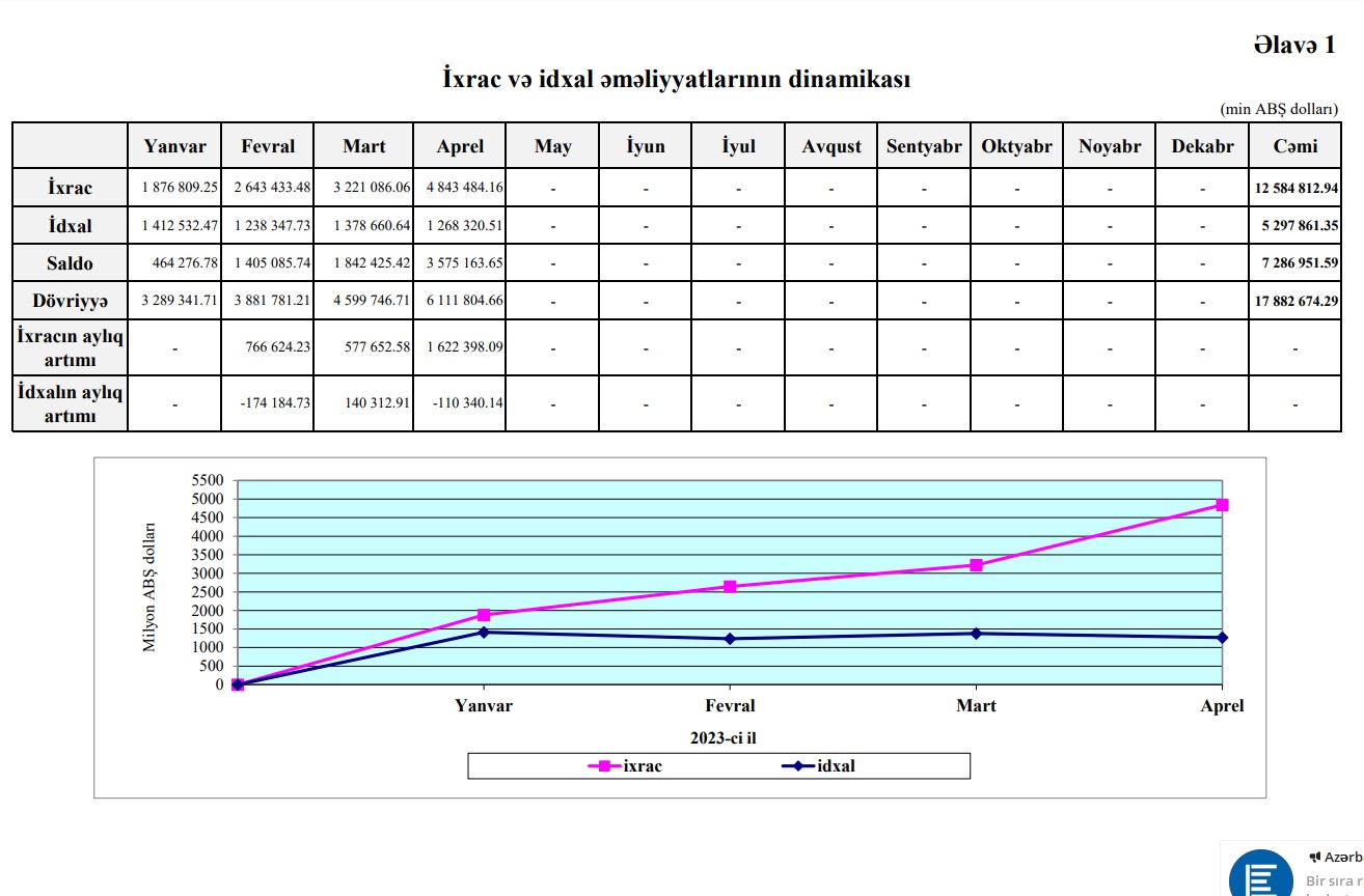 2023-cü ilin yanvar-aprel dövründə Azərbaycanın xarici ticarət əməliyyatlarının həcmi 17 milyard 882 milyon 674 min ABŞ dolları təşkil edib.
