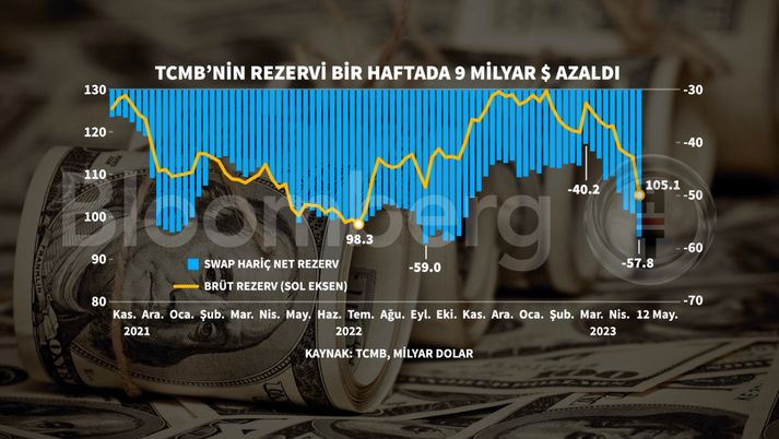 Türkiyə Cümhuriyyəti Mərkəzi Bankının (TCMB) ümumi ehtiyatları seçkilərdən bir həftə əvvəl 9 milyard dollar azalaraq 105,1 milyard dollar olub.Türkiyə Cümhuriyyəti Mərkəzi Bankının (TCMB )ümumi ehtiyatlarında pandemiya dövründən bəri ən kəskin azalma seçkidən bir həftə əvvəl müşahidə edilib. Xalis ehtiyatlar da son 21 ilin ən aşağı səviyyəsinə düşüb.