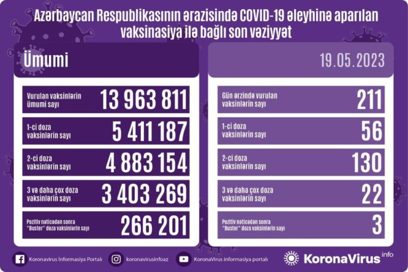 Azərbaycanda son sutkada koronavirus (COVID-19) əleyhinə 211 vaksin vurulub. Bir gündə birinci mərhələ üzrə vaksinasiya olunanların sayı 56, ikinci mərhələ üzrə vaksinasiya olunanların sayı 130, üç və daha çox doza üzrə vaksinasiya olunanların sayı 22, pozitiv nəticədən sonra buster doza üzrə vaksinasiya olunanların sayı 3 nəfərdir.