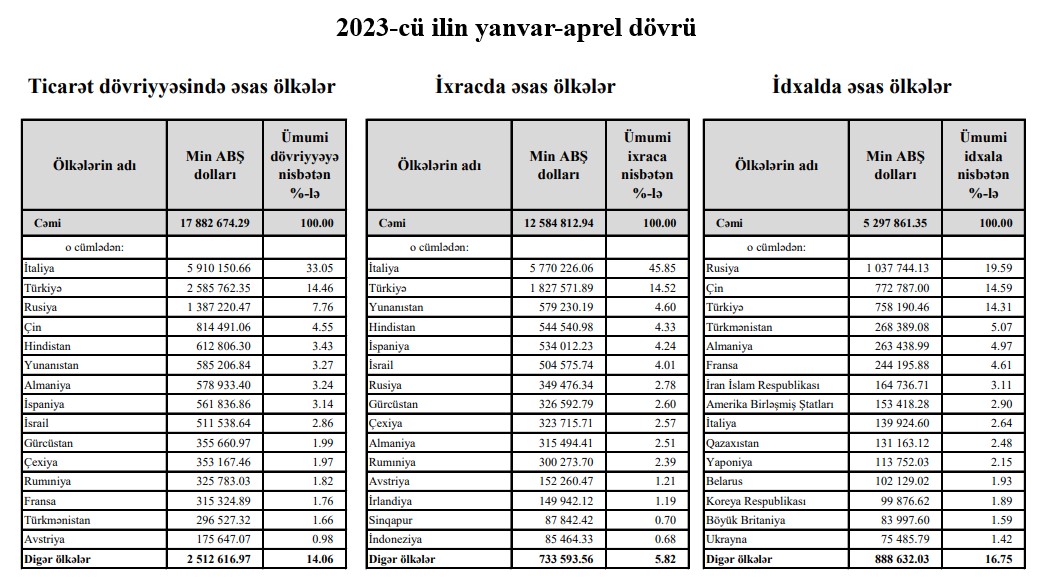 Qeyd edək ki, 2023-cü ilin yanvar-aprel dövründə Azərbaycanın xarici ticarət əməliyyatlarının həcmi 17 milyard 882 milyon 674 min ABŞ dolları təşkil edib. O cümlədən, ixrac əməliyyatları 12 milyard 584 milyon 813 min ABŞ dolları, idxal əməliyyatları 5 milyard 297 milyon 861 min ABŞ dolları olub. Nəticədə 7 milyard 286 milyon 951 min ABŞ dolları saldo yaranıb.