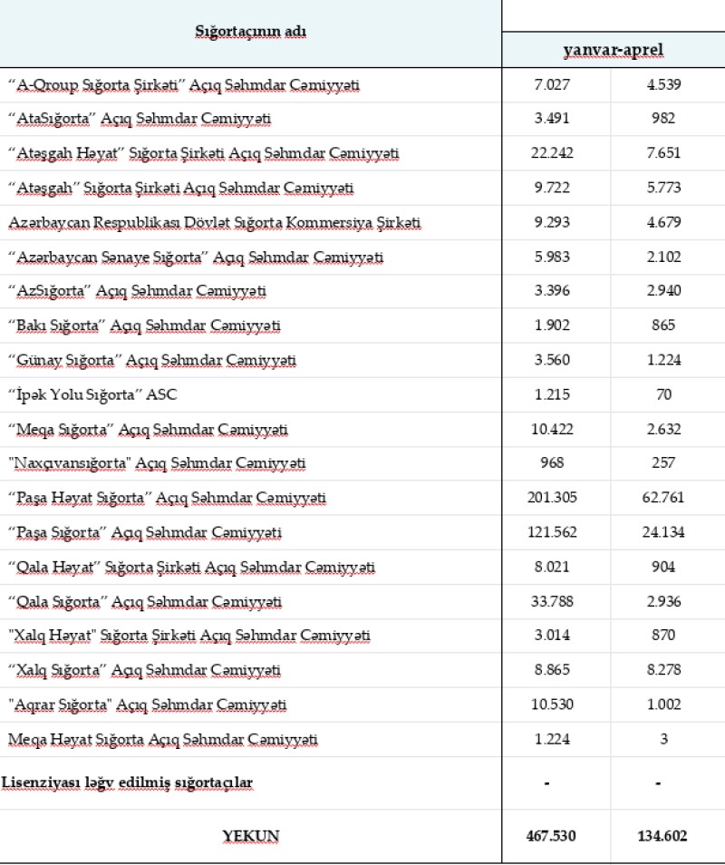 2023-cü ilin ilk 4 ayı ərzində (yanvar-aprel) Azərbaycandakı sığorta şirkətləri tərəfindən 467 milyon 530 min manat sığorta haqları hesablanıb, 134 milyon 602 min manat sığorta ödənişləri həyata keçirlib.