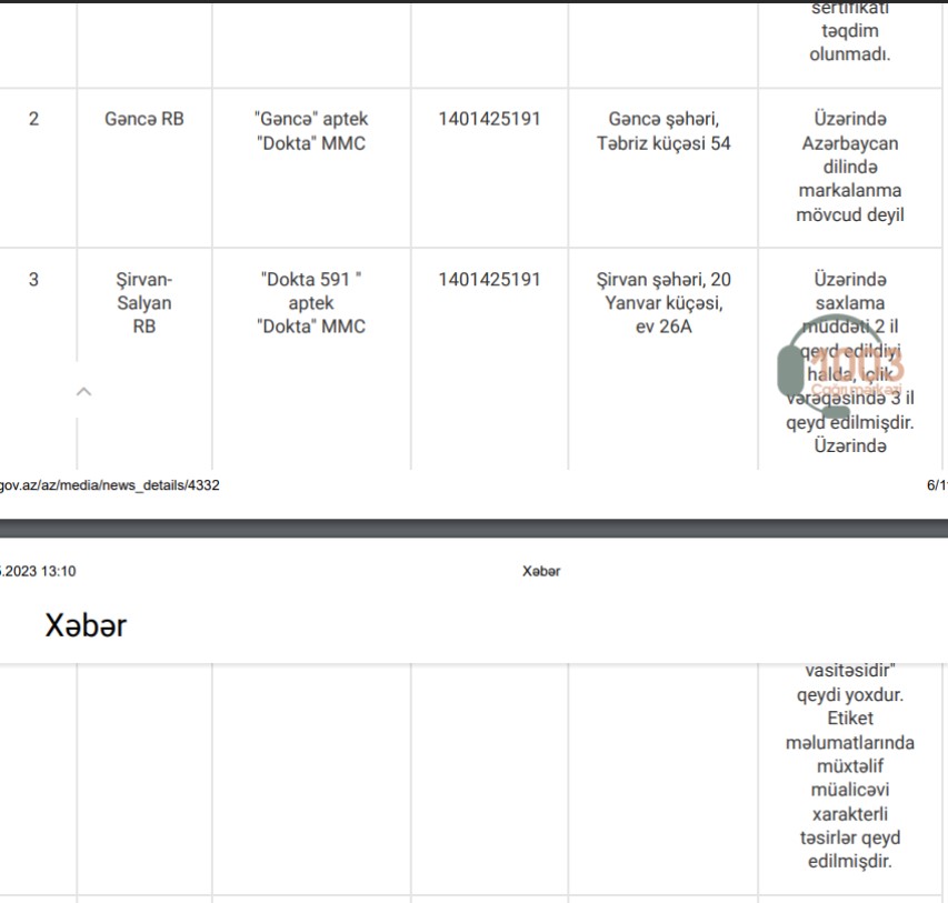 Yoxlamalar zamanı nöqsan aşkar edilən apteklər, həmçinin bioloji aktiv qida məhsullarının etiket və istifadə təlimatlarında qeydə alınan uyğunsuzluqlarla aşağıdakı cədvəllər vasitəsilə tanış ola bilərsiniz: